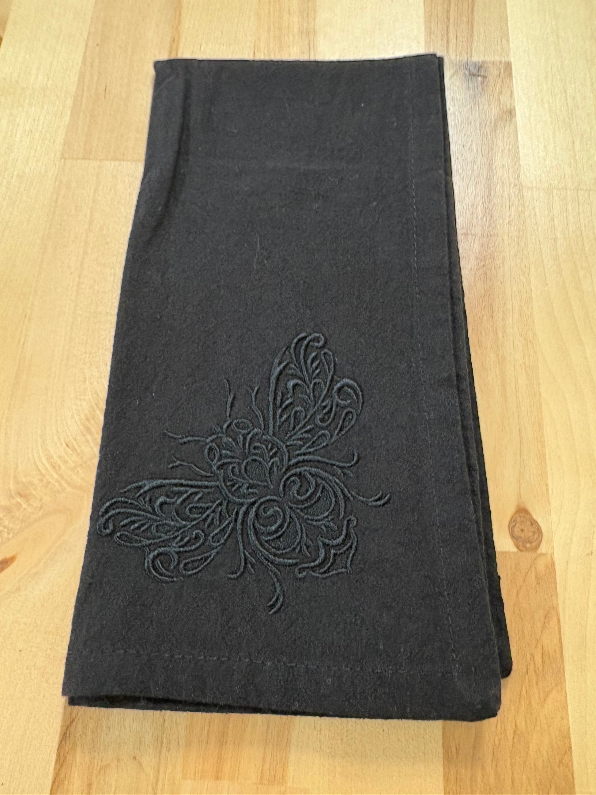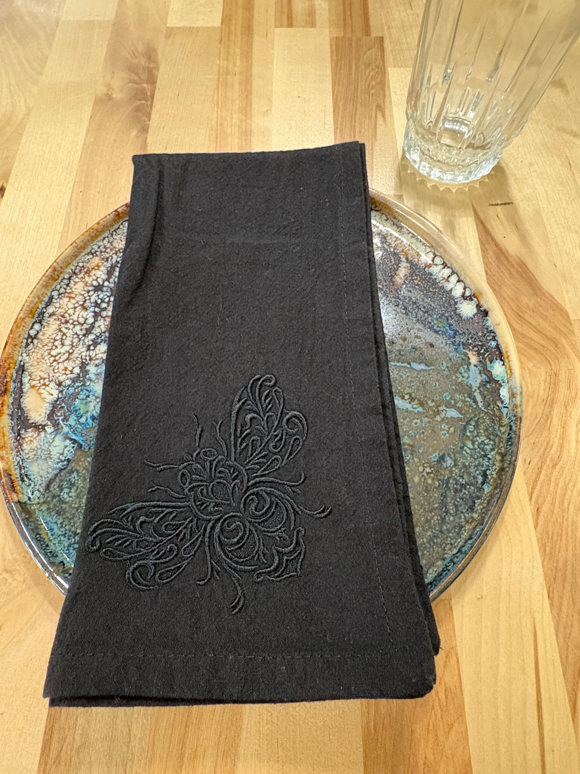 Enhance your dining experience with our delicately embroidered bee napkin. Made with high-quality flour sack material, this elegant addition features a black bee embroidery using black thread. Perfect for any occasion, add a touch of sophistication and beauty to your table setting.
