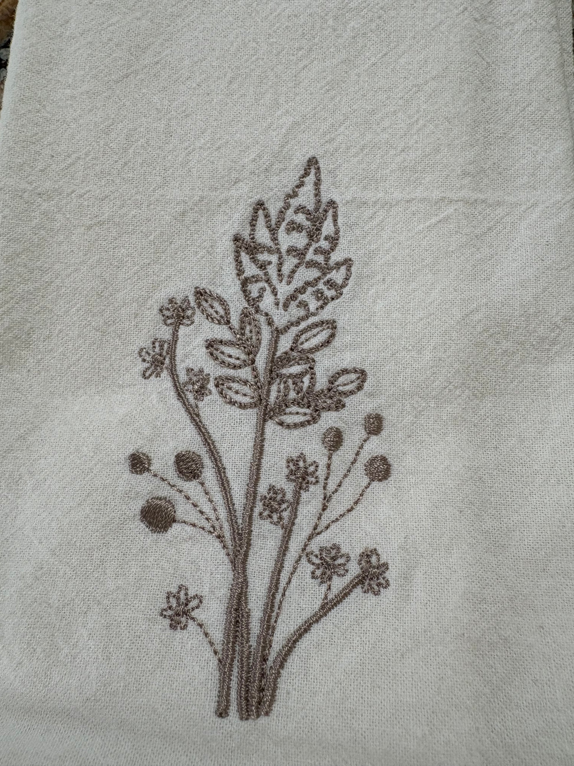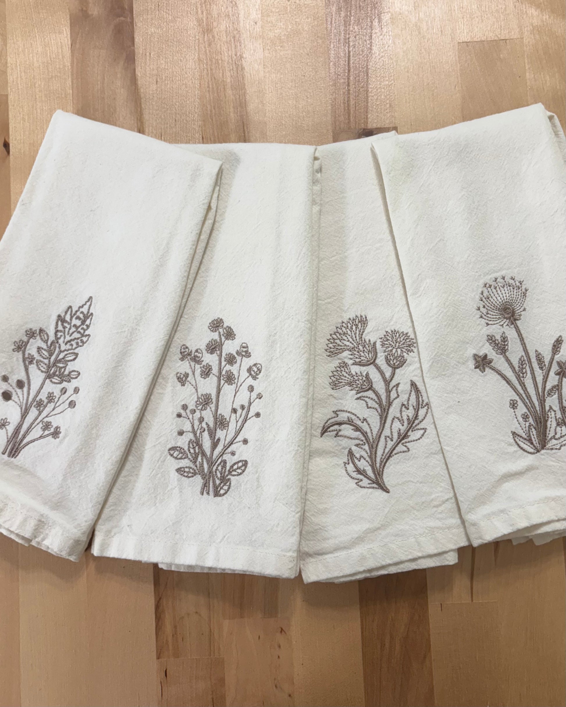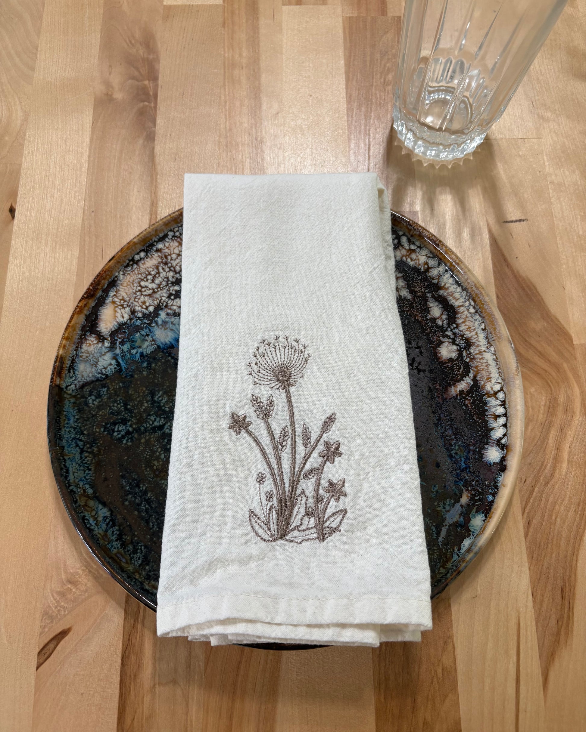 Elevate your dining experience with our organic flour sack napkins. Our delicate stems, embroidered with tan thread, add a touch of natural elegance. Choose from dandelion, thistle, daisy, or golden rod designs for a personalized touch. Made from high-quality material, these napkins are both beautiful and sustainable.