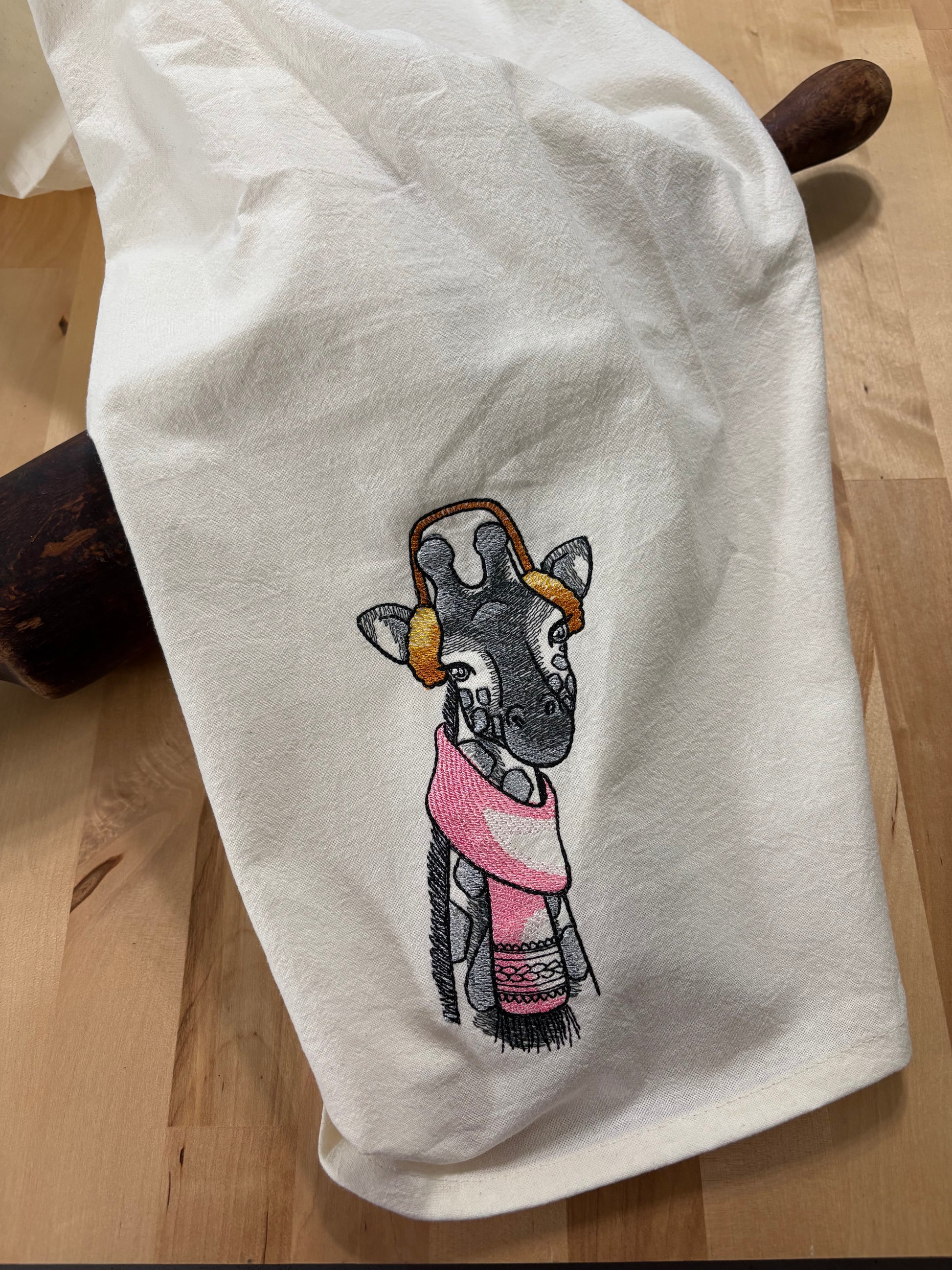 "Add some playful charm to your kitchen with our Chilly Weather Giraffe Kitchen Towel! This fun flour sack towel features an embroidered giraffe braving the cold, and it's machine washable for easy clean up. Perfect for spicing up your cooking routine with some quirky flair!"