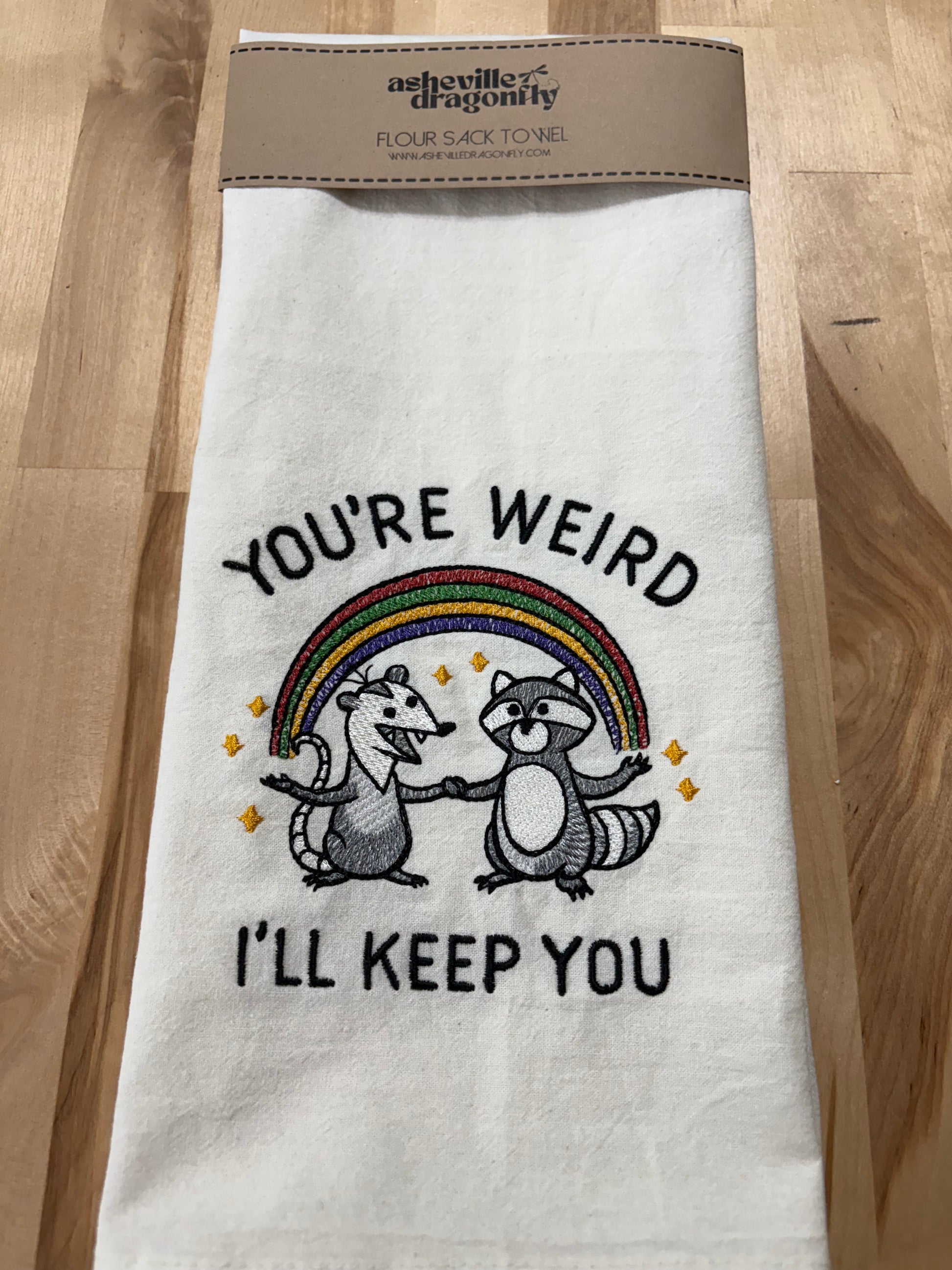 Unleash your quirky side with our "You're Weird, I'll Keep You" kitchen towel. Made of soft cotton flour sack material, this towel is embroidered with a playful message that will make you smile every time you use it. Perfect for any quirky cook or as a unique gift for your weird but lovable friends.